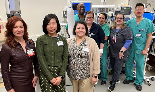 Pictured from left, are Kristin G. Fless, MD, Chair of the Department of Medicine and Medical Director of Respiratory Services and Pulmonary Rehabilitation; Yu Maw Htwe, MD, Director of Interventional Pulmonology; Maria Dimi, Administrative Director of the Respiratory Care Department; and Patrick Anicette, BSRT, Kim Mencl, RRT, Dayana Chavez, RRT, Terry Bee, RRT, and David Gozali, RRT, from the Respiratory Care Department.