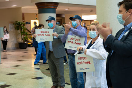 Members of the hospital’s Management Team and Medical Staff stand in long reception lines to cheer and applaud incoming and outgoing staff.