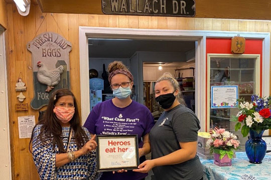 Yvonne Redline, MMCSC Foundation, presents a ‘Heroes Eat Here’ certificate to Courtney Berlin and Hanna Fernandez of Wallachs Farm Market & Deli, Toms River, in recognition of their support to our Healthcare Heroes.