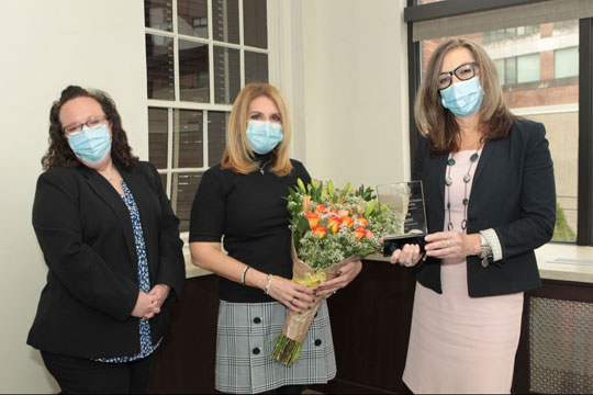 Regional Chief Nursing Officer Diann Johnston, right, and Magnet Program Director Lauren Fleming, left, presented Nicole Keegan, Director of Pain Management Services at Monmouth Medical Center, with the Organization of Nurse Leaders New Jersey (ONL NJ) Excellence in Advanced Practice Nursing Leadership Award during a virtual ceremony on December 4.