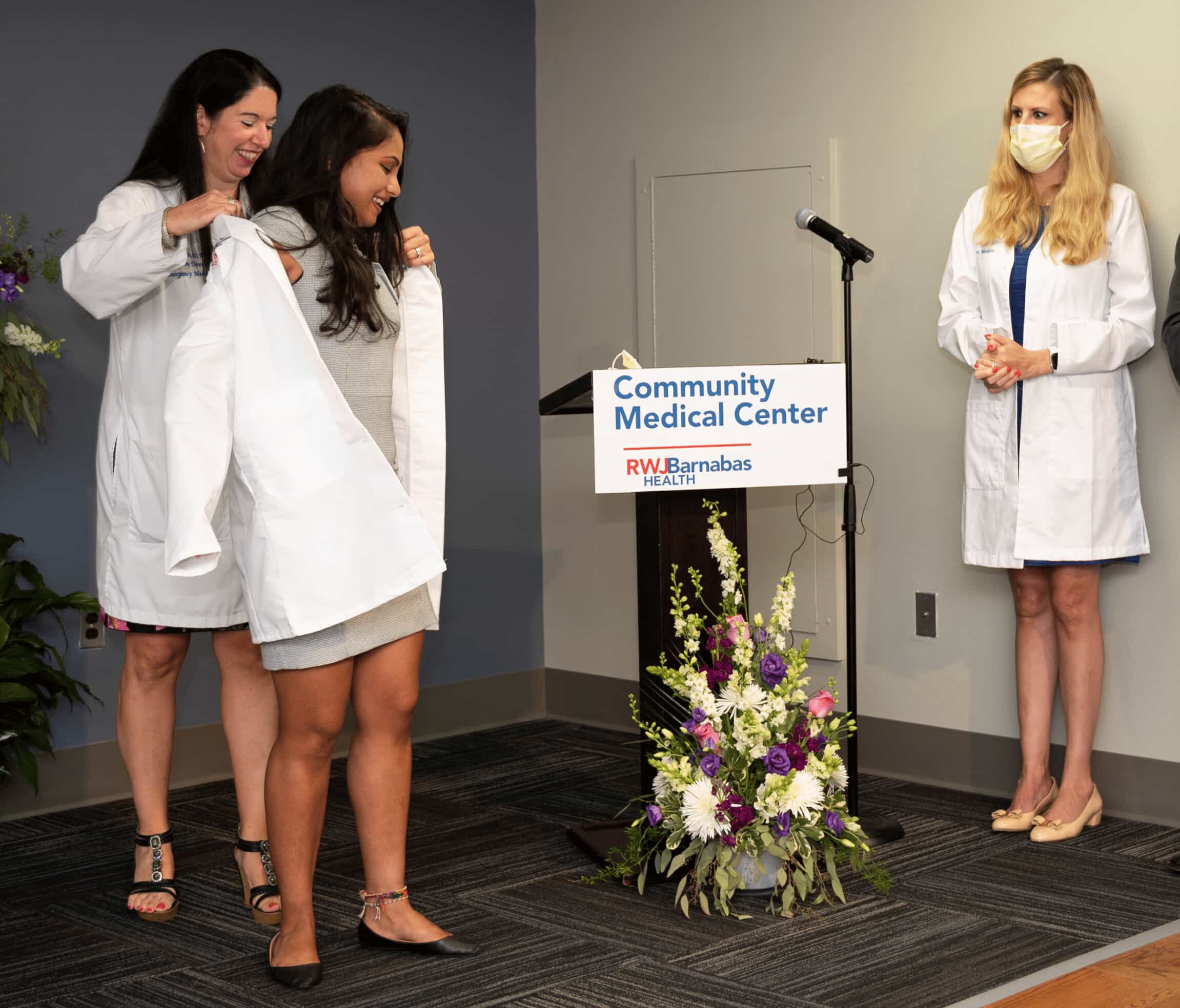 Nileena Johnkutty, DO, an Emergency Medicine resident in Community Medical Center's Graduate Medical Education program, receives her long coat from Nicole Maguire, DO, FACEP, Program Director, Emergency Medicine, (left), and Danielle Biggs, MD, Associate Program Director, Emergency Medicine, (right) during the program's Long Coat Ceremony. Dr. Johnkutty is part of the first group of residents at the hospital located in Toms River, New Jersey.