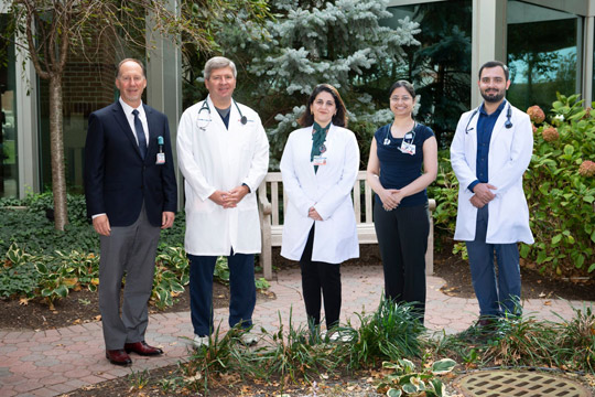 Pictured from left are Kenneth M. Granet, MD, FACP, the hospital’s Chief Medical Officer and Immediate Past Chairman of the Department of Medicine; Dean Patton, MD, Medical Director of Pulmonary Rehabilitation and Critical Care Medicine; and Internal Medicine resident physicians Reem Alhashemi, Ikwinder Preet Kaur, and Mohsin Sheraz Mughalan.