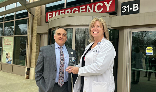 Pictured at Monmouth Medical Center Southern Campus, Lakewood, is Dr. Philip G. Passes, Chief Administrative Officer, and NJENA award recipient, Jennifer Lees, RN, MSN, NE-BC, Director of Emergency Services, who recently received the Clinical Nurse Leadership Award.