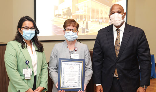 Daniela Padilla, Hospital Services Manager, NJ Sharing Network presents Darrell K. Terry, Sr., MHA, MPH, FACHE, President and Chief Executive Officer, Newark Beth Israel Medical Center and Children’s Hospital of New Jersey and Amy Doran, RN, MSN, APN-C,Chief Nursing Officer and Vice President of Patient Care Services receive the HRSA’s Workplace Partnership for Life Hospital Campaign Platinum Award.