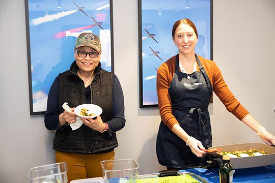 Monmouth Medical Center dietitian Jennifer Klein is shown with Soldier On resident and Army veteran Cynthia Scott, who samples the sweet potato kale hash recipe that was demonstrated.