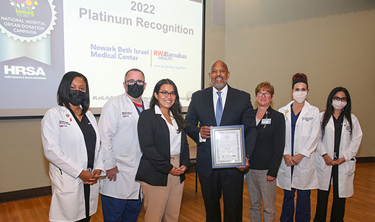 Newark, NJ (Sept. 27, 2022) — Newark Beth Israel Medical Center was recently awarded Platinum Level recognition from the United States Department of Health and Human Services, Health Resources and Services Administration (HRSA) Workplace Partnership for Life (WPFL) Hospital Organ Donation Campaign for its efforts to increase enrollment in the New Jersey state organ donor registry and to spread the life-saving message of organ and tissue donation.