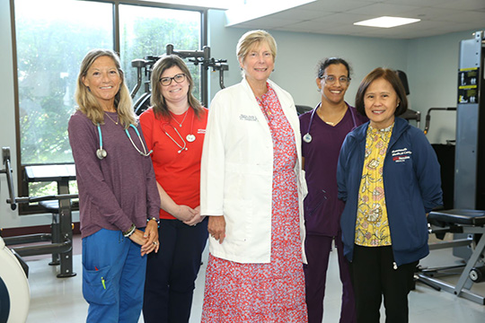 Shown from left are members of the MMC Pulmonary Rehabilitation team Respiratory Therapist Bethanne Tinkler, Registered Nurse Mallory Collins, Administrative Director of Cardiology Services, Renal & Nursing Resources Maureen Bowe, Exercise Physiologist Chrissy Castillo-Chumpitaz, and Cardiopulmonary Care Center Patient Care Director Marietta Datar.