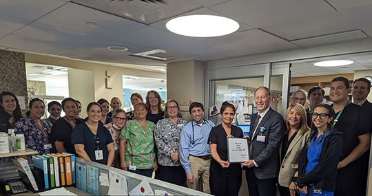 NICU Medical Director Meera Kale, M.D., has been named MMC Physician of the Month for December. Presenting the award is Chief Medical Officer Kenneth Granet, M.D. They were joined for the presentation by NICU team members and hospital leadership.
