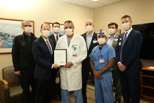 Monmouth Medical Center Chair of Anesthesiology Waheed Eraky, M.D., was honored as the hospital’s first Physician of the Month. Presenting the award is Chief Medical Officer Kenneth Granet, M.D., and from left are Wael Ghali, M.D., Secretary of the MMC Medical Staff, Michael Perdoni, Vice President of Clinical Operations and member of the Physician of the Month Committee, President and CEO Eric Carney, Vin Prabhat, M.D., Vice President of the Medical Staff, Chief Financial Officer Cory Lasker, and Chief Human Resource Officer Rick Kiernan.