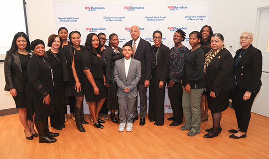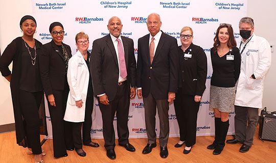 Caption: Linda Kamateh, Assistant Vice President of Public Relations and Marketing, Newark Beth Israel Medical Center and Children’s Hospital of New Jersey (NBI); Atiya Jaha Rashidi, MHA, RN, Chief Equity Officer and Vice President and Community Relations, NBI; Amy Doran, BA, BS, MS, APN-c, Chief Operating Officer, NBI; Darrell K. Terry, Sr., MHA, MPH, FACHE, FHELA, President and Chief Executive Officer, NBI; Jeh Johnson, former United States Secretary of Homeland Security; Denise Shepherd, MA, RN, Chief Nursing Officer, NBI; Laura Budinick, Psy.D., Chief Administrative Officer, NBI; and Charles Cathcart, MD, Chief Medical Officer, NBI