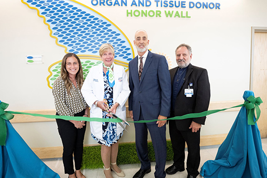 Carney praised Bowe’s commitment to organ donation, calling her a champion who was the driving force behind the honor wall and an amazing and devoted advocate for organ donation awareness. He also paid tribute to the many hospital staff members who participate on the organ and tissue recovery team, noting, “Their commitment to facilitating the gift of life with the utmost compassion in the face of tragic circumstances is inspirational for our entire hospital family.”