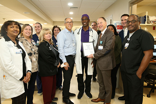 Emergency Medicine physician Michael Dyce, M.D., has been named MMC Physician of the Month for November. Presenting the award is Chief Medical Officer Kenneth Granet, M.D. They were joined for the presentation by Emergency Department team members and hospital leadership.