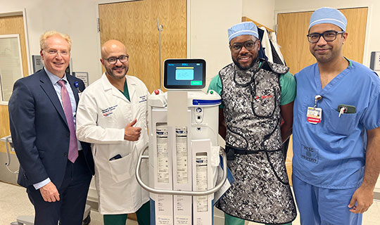 The Interventional Cardiology Team at Newark Beth Israel Medical Center (L to R): Sergio Waxman, MD, MBA, Chief of the Division of Cardiology, Khalil Kaid, MD, Director of Interventional Cardiology, who performed NJ’s first intracoronary supersaturated oxygen (SSO2) procedure on November 7, 2023, Christopher Nnaoma, MD, and Umair Bajwa, MD.
