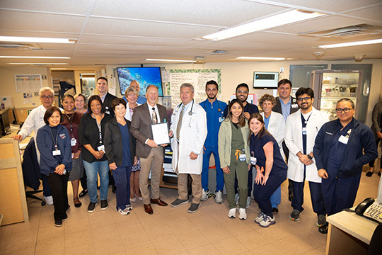 Critical Care Physician Chandler Dean Patton, M.D., has been named MMC Physician of the Month for September. Presenting the award is Chief Medical Officer Kenneth Granet, M.D. They were joined for the presentation by Intensive Care Unit team members and hospital leadership.