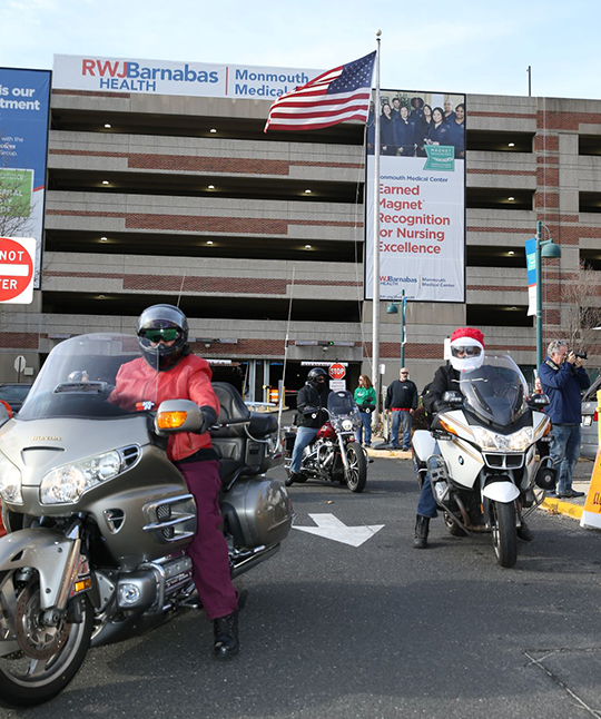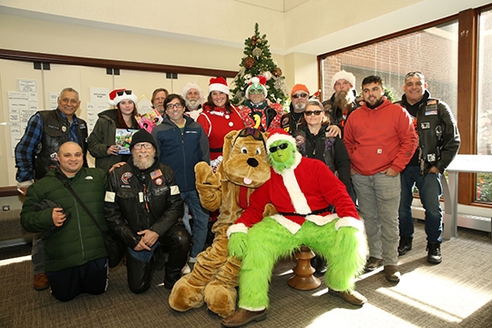 The riders gather with some special holiday friends in the Monmouth Medical Center lobby.