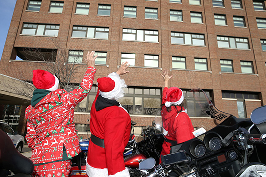 Santa, Mrs. Claus and Santa’s helper wave to Monmouth Medical Center patients and staff after arriving at the hospital.
