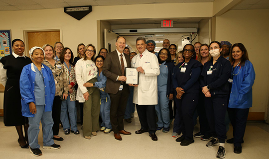 Richard S. Lazzaro, M.D., FACS, Chief of Thoracic Surgery for the RWJBarnbas Health Southern Region, been named MMC Physician of the Month for December. Presenting the award is MMC’s Chief Medical Officer Kenneth Granet, M.D. They were joined for the presentation by team members from Perioperative Services and hospital leadership.