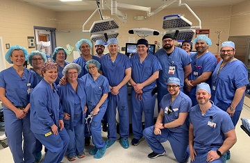 RWJUH Hamilton’s OR team recently celebrated the addition of Globus Medical’s ExcelsiusGPS® technology for robotic spine surgery. They were joined by orthopedic spine surgeon Jose A. Canseco, MD PhD, second row, fourth from right; Marc Levine, MD, Director of Orthopedic & Spine Institute, Orthopedics Department of Surgery, Section Chief, Medical Staff, second row, sixth from right; Michael Gordon, MD, Chairman, Department of Anesthesiology, second row, fourth from left ; Lisa Breza, Chief Administrative Officer, second row, second from left; Joan Bercari, Vice President of Quality and Patient Safety, second row, third from left; Seth Rosenbaum, MD, MMM, Senior Vice President and Chief Medical Officer, second row, first on right; and John DiLeo, Vice President of Finance, bottom row, first on right.