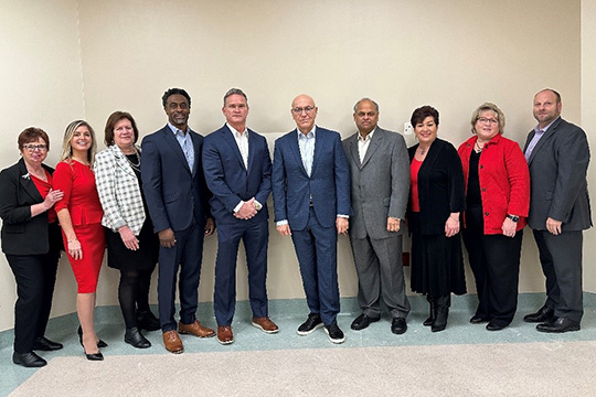 Pictured from left to right are Diane Grillo, Vice President, Health Promotion; Stephanie Harvilla, Director, Cardiology Services; Joan Bercari, Vice President, Quality and Patient Safety; Hamilton Cardiology Associates physicians, Edward A. Wingfield, MD; Ronald G. Ryder, DO; Mahmoud Ghusson, MD; and Jay Patel, MD; Nina Melker, Chair of the RWJUH Hamilton Board of Trustees; Lisa Breza, Chief Administrative Officer; and Seth Rosenbaum, MD, SVP and Chief Medical Officer.