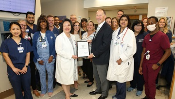 CAPTION: Internist Doantrang Du, M.D., has been named MMC Physician of the Month for June. Presenting the award is Chief Medical Officer Kenneth Granet, M.D. They were joined for the presentation by team members on the G5 Medical-Surgical Unit and hospital leadership.
