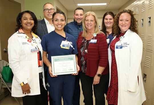 Veronica is shown holding her DAISY Award certificate with, from left, Sharmine Brassington, Administrative Director of Emergency Services; Dr. William Downs, Chairman of Emergency Medicine; Christopher Werner, Assistant Clinical Director of the Emergency Department; Ann Szapor, Chief Nursing Officer; Tara Pistone, Assistant Clinical Director of the Emergency Department; and Lauren Fleming, Magnet Program Director.