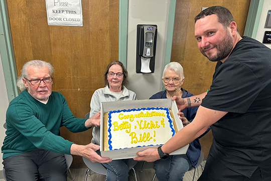 Billy, Vicky and Betty successfully completed the Pulmonary Rehab Program at RWJUH Hamilton, and celebrated with a cake presented by Lead Pulmonary Function/Rehab respiratory therapist David Rubino, BSRT, RRT, CPFT.
