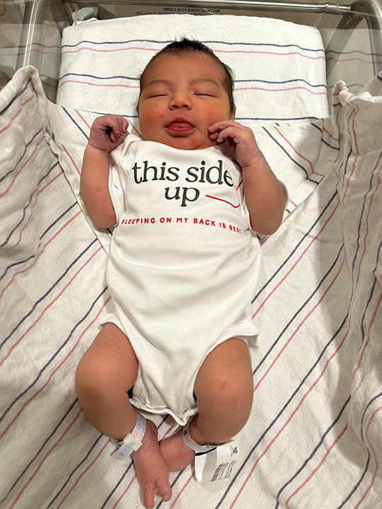 Newborn from Robert Wood Johnson University Hospital Somerset wearing a safe sleep baby bodysuit.