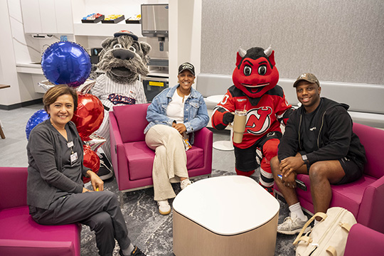 New Jersey Devils N.J., and Somerset Patriots Sparkee visit with patients and employees to celebrate the opening of the Jack & Sheryl Morris Cancer Center