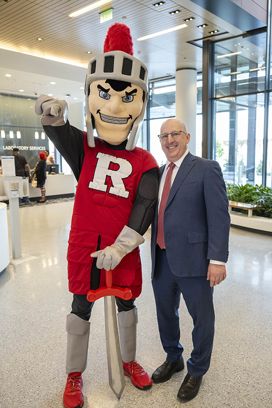 Dr. Steven Libutti, William N. Hait Director of Rutgers Cancer Institute and Senior VP of Oncology Services, RWJBarnabas Health, with the Rutgers Scarlet Knight to commemorate the start of patient care at the Jack & Sheryl Morris Cancer Center
