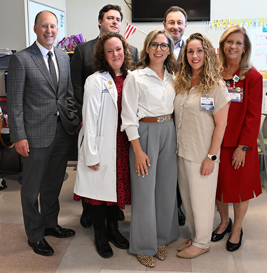 Cheryl is shown center with, from left, Dr. Kenneth Granet, Chief Medical Officer; Cory Lasker, Vice President of Finance; Lauren Fleming, MA, BSN, RN, MEDSURG-BC, Magnet Program Director; Dr. Dmitry Oleynikov, Chair of Surgery; Jenna DiBartolo, MSN, RN, CNOR, Assistant Vice President, Perioperative Services; and Ann Szapor, MBA, BSN, RN, NEA-BC, Chief Nursing Officer.