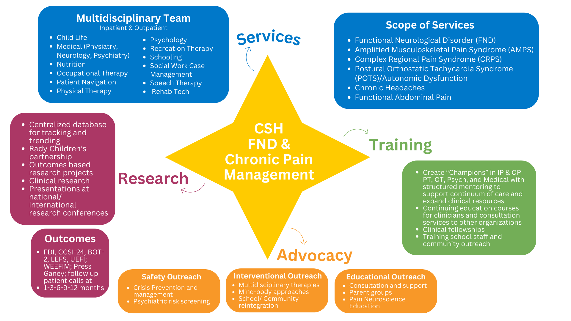 The mission of Children’s Specialized Hospital’s Center of Excellence for Chronic Pain and FND is to support improvement in functional independence, participation in daily routines and promote overall quality of life for children and adolescents, affected with Chronic Pain and Functional Neurological Disorder (FND) conditions, using a multidisciplinary rehabilitation model.