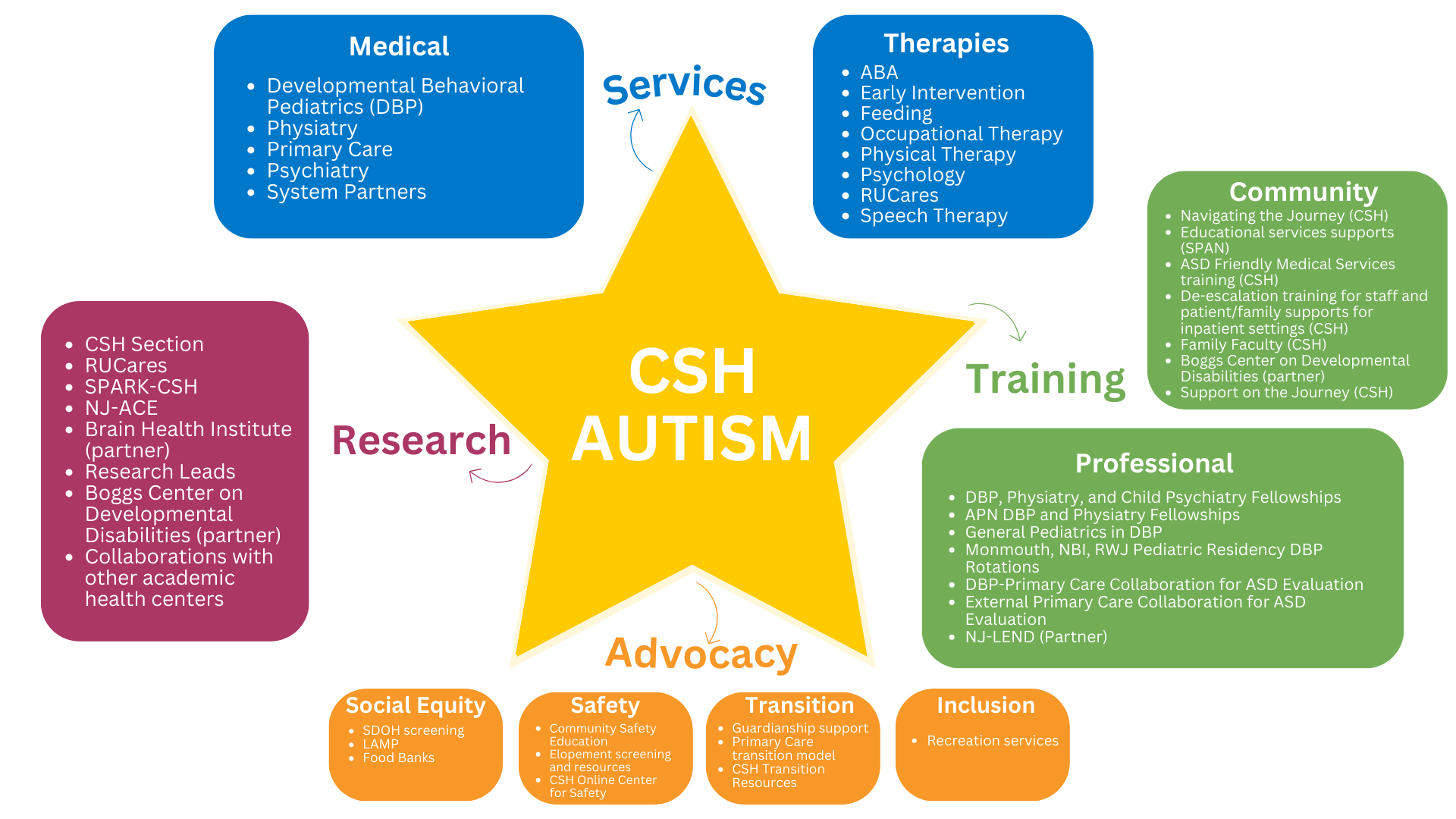 The mission of CSH AUTISM, Children’s Specialized Hospital’s Center of Excellence for Autism Services, Training, Advocacy, and Research is to support fulfilling lives for autistic individuals and their families. The mission rests upon these values: supporting lives with meaning and purpose, exercising choice, building on strengths, and empowering access to needed resources. We are dedicated to excellence across these domains: