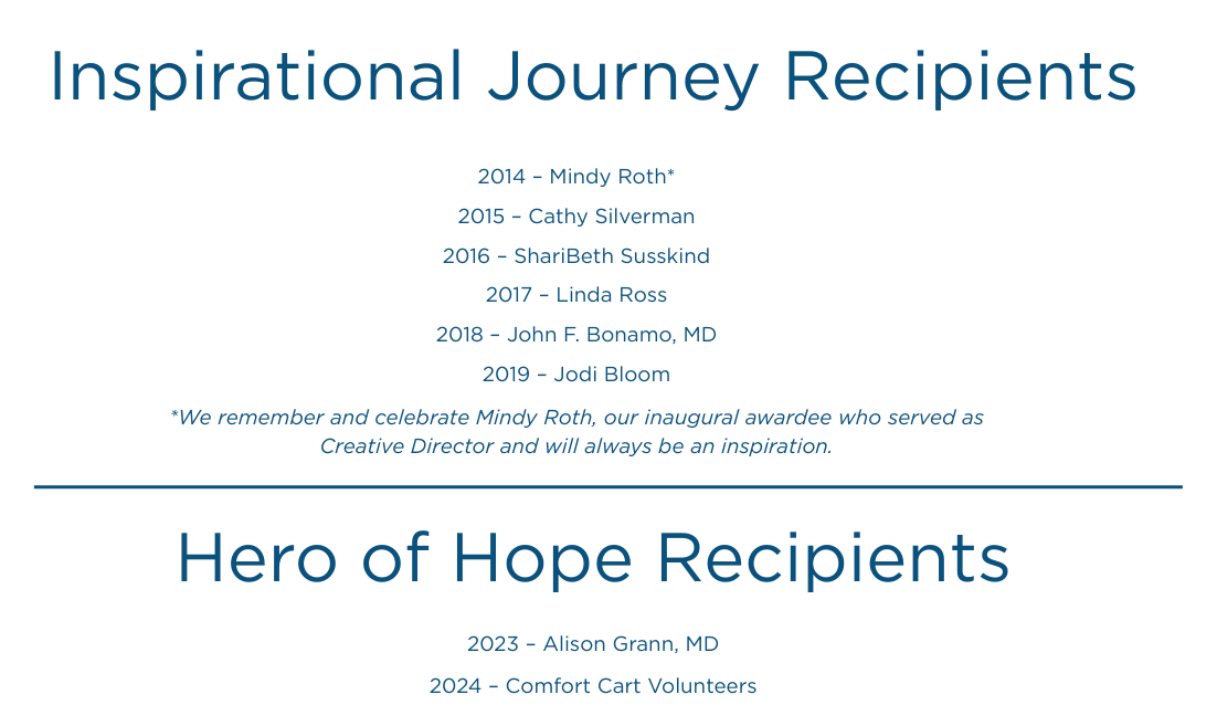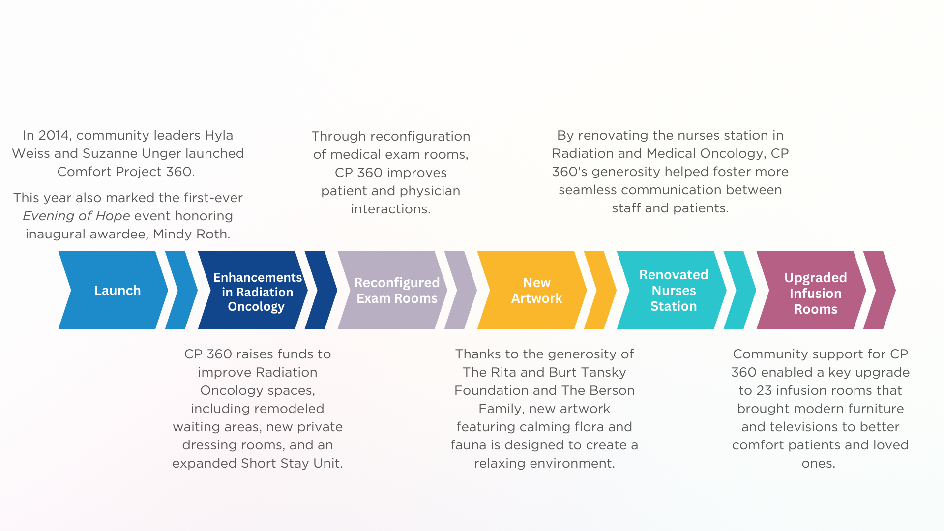 Comfort Project 360 was founded by Hyla Weiss and Suzanne Unger in 2014. Generous donations and community support have enabled CP 360 to fund meaningful renovations and to introduce important programs and amenities that support cancer care and patient wellbeing. In addition, CP 360’s showcase event, An Evening of Hope (formerly A Reason to Rock), celebrates members of the community who have made a meaningful difference in the fight against cancer as Hero of Hope (formerly Inspirational Journey) recipients. The timeline that follows captures CP 360’s inspirational impact on cancer care at Cooperman Barnabas Medical Center.