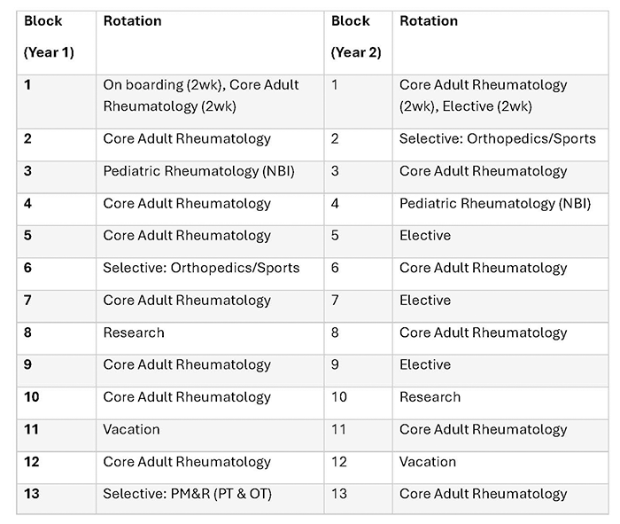 - Core Adult Rheumatology (7.5 blocks): Inpatient consults and outpatient clinics at JCMC.
