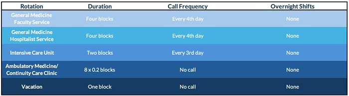 Each ICU team consists of up to 2 PGY-3 residents, 1 PGY-2 resident, and 2 PGY-1 residents. Residents gain experience in critical care, ventilator management, and vasopressor support. Multidisciplinary rounds with a teaching intensivist, respiratory therapists, critical care nurses, pharmacists, clergy, case managers, and auxiliary staff are held daily.