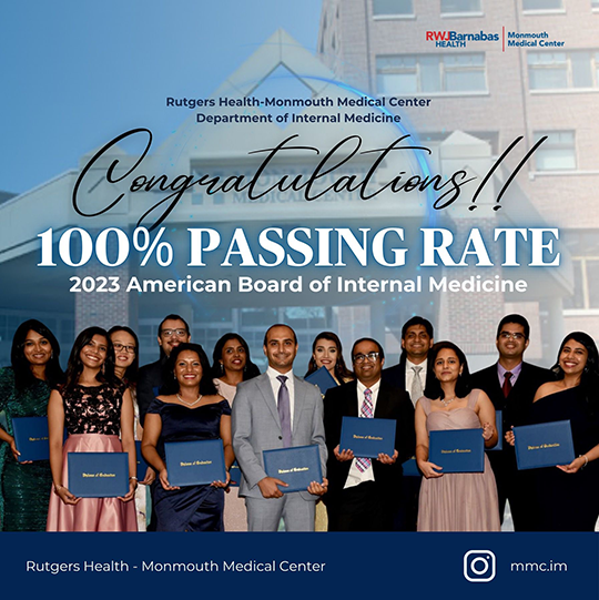 Graduates of the Monmouth Medical Center Internal Medicine Residency have consistently had board passing rate well above national average for many years. The lastest 3 year cumulative pass rate is 100%.