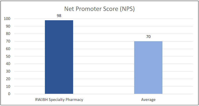 The analysis compared other large Specialty Pharmacy Providers Net Promoter scores to the RWJBarnabas Health Specialty Pharmacy. A Net Promoter Score (NPS) is a cross-industry standardized index ranging from -100 to 100 that measures a customer’s overall satisfaction with a company’s product or service, as well as a customer’s loyalty to the brand. Determining an NPS allows for a comparison between specialty pharmacy and other service-oriented organizations in a variety of sectors.