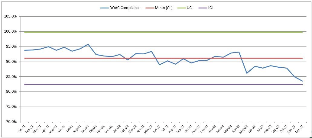 In 2023, RWJBarnabas Health underwent an EHR conversion in the majority of its facilities. This resulted in changes in the prescribing restrictions on direct oral anticoagulants. This will continue to be monitored.