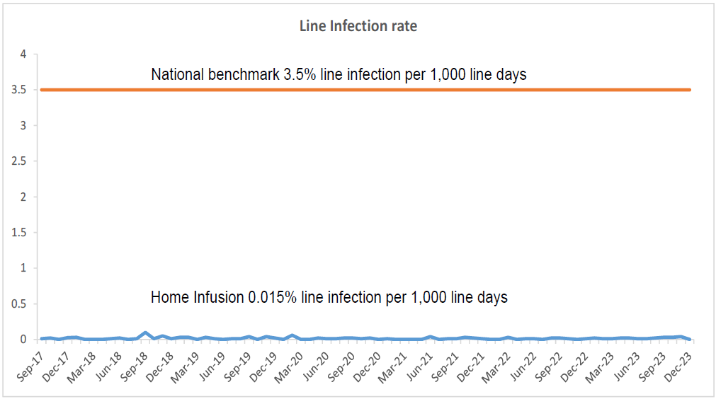 The RWJBarnabas Health Home Infusion Division through the dedication of its Home Infusion Nurses has maintained strict adherence to the Centers of Disease Control criteria for preventing intravenous line infections. Our nurses have consistently maintained an infection rate that is 18 times below the national benchmark.