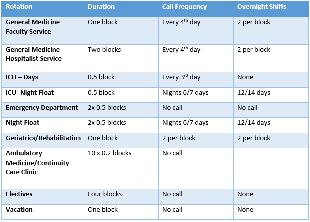 Description: Residents go on night float six days per week, from 8:30 PM to 7:00 AM daily. Night admissions are signed out formally to the morning teams to ensure appropriate transitions of care.