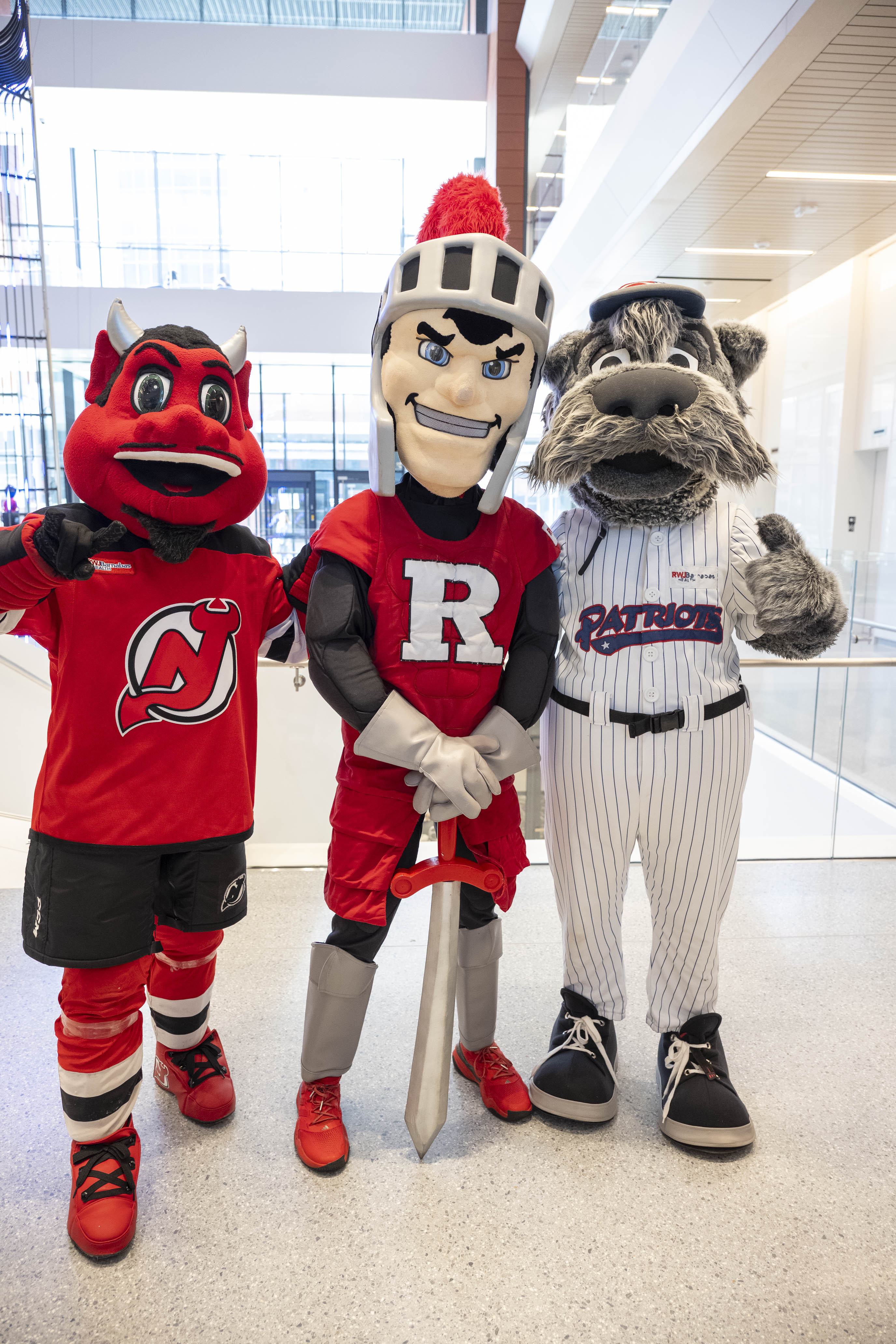 The Rutgers Scarlet Knight, New Jersey Devils N.J., and Somerset Patriots Sparkee help to celebrate the opening of the Jack & Sheryl Morris Cancer Center