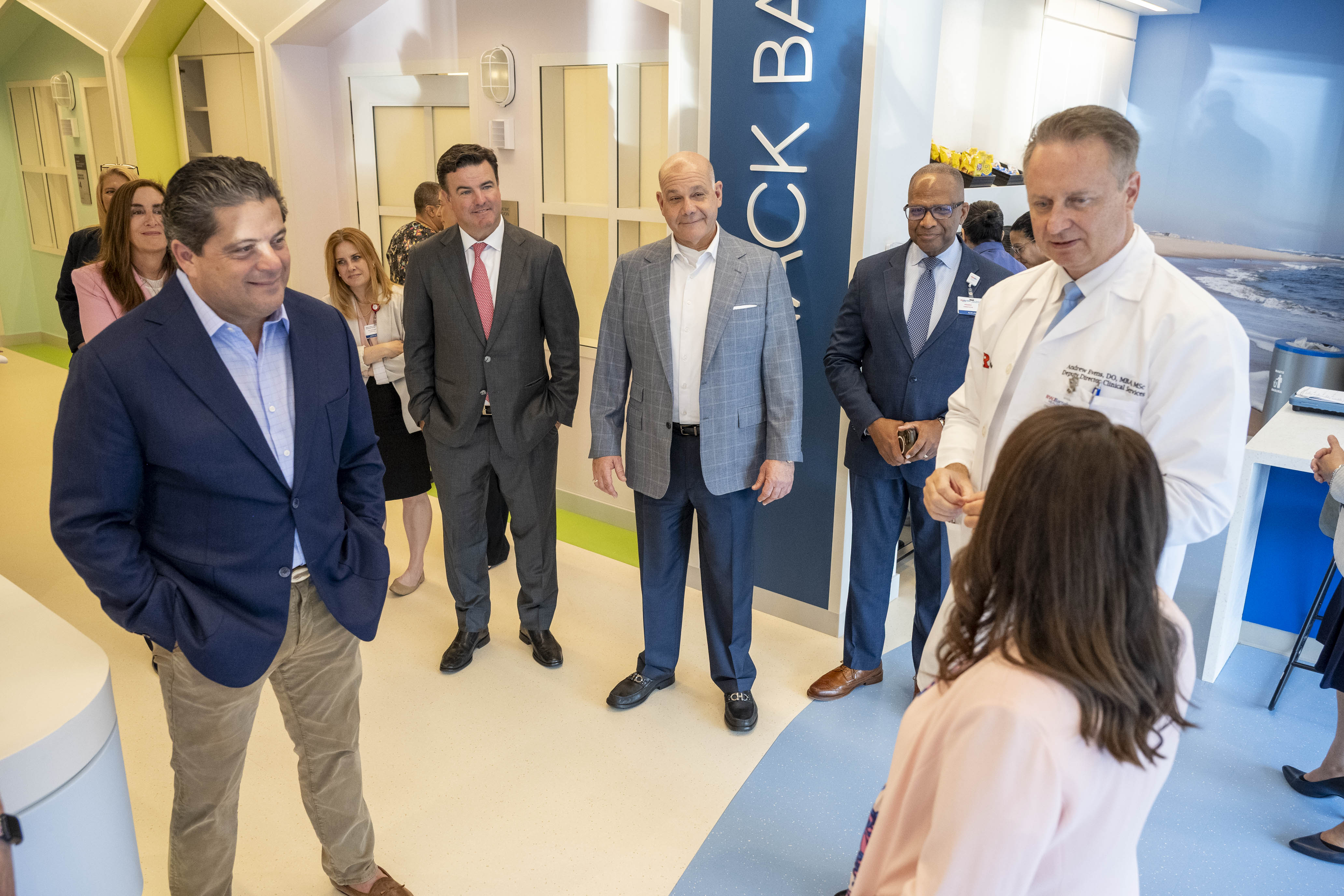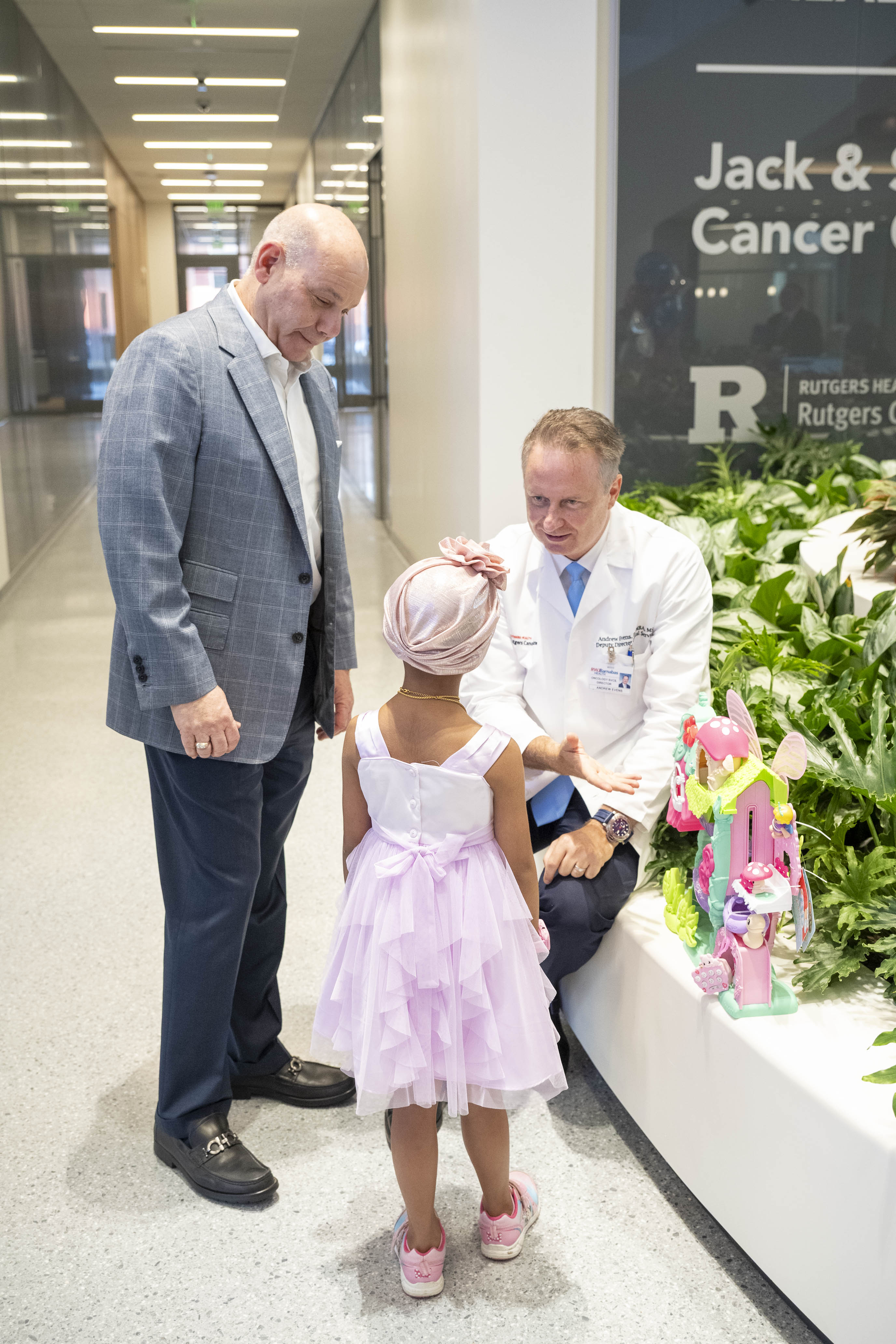 Dr. Andy Evens, Chief Physician Officer, Jack & Sheryl Morris Cancer Center, and Jack Morris, Chair of the Board of RWJUH visit with 5 year old pediatric cancer patient, Serina Patel