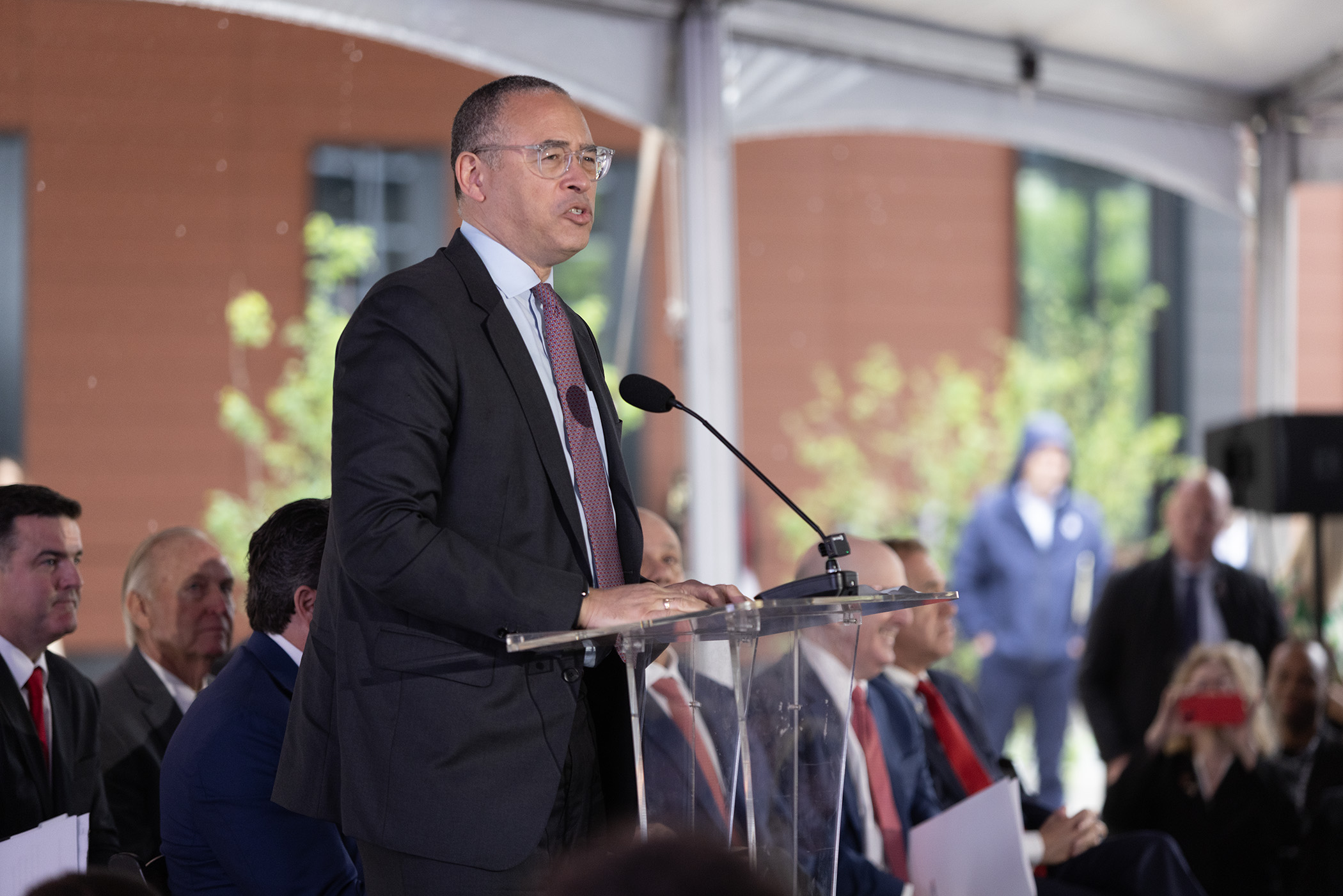 Dr. Steven Libutti, William N. Hait Director of Rutgers Cancer Institute and Senior VP of Oncology Services, RWJBarnabas Health, with the Rutgers Scarlet Knight to commemorate the start of patient care at the Jack & Sheryl Morris Cancer Center