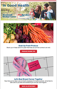 In the future, you will receive issues of our In Good Health and/or e-Healthy Child, our pediatrics newsletter featuring articles about the latest programs and services at Monmouth Medical Center and The Unterberg Children's Hospital at Monmouth.