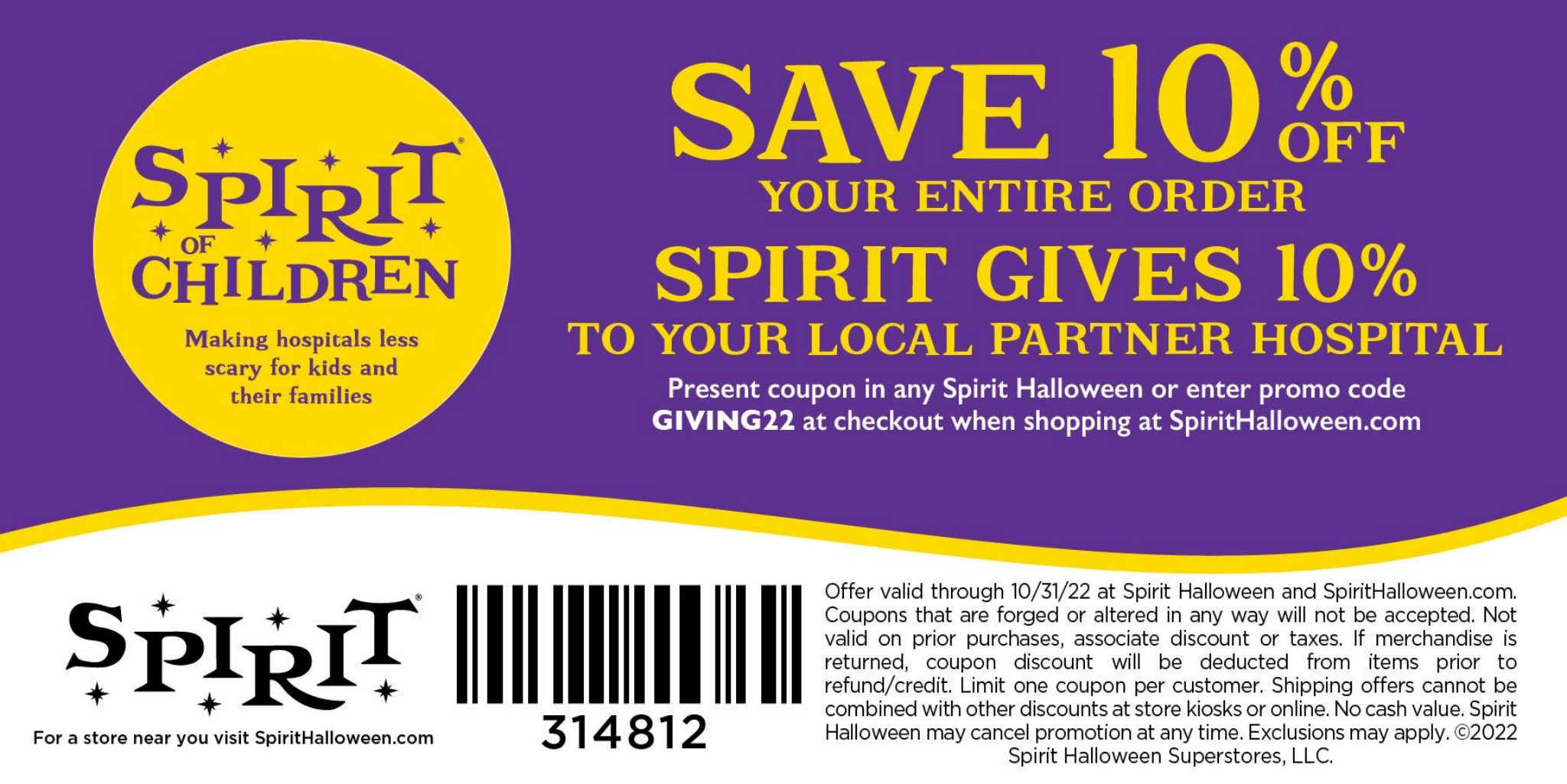 By using the below digital coupon, you can save 10% off all purchases in-store or on-line, and 10% of all proceeds will benefit Child Life Programs at Spirit of Halloween Partner organizations.