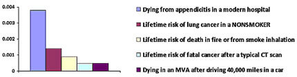 The amount of radiation during a typical body CT scan (10 mSv) is about the same as the radiation we get every two years from background sources, and the risk of getting a fatal cancer from this amount of radiation is about 1 in 2000. This may sound like a lot, but the graph below puts this risk in the context of other risks that are of similar magnitude. Notice that a patient who never smoked is more than twice as likely to die from lung cancer as from a cancer caused by a typical CT scan.