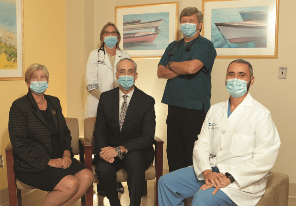 Gathering in the newly renovated home of MMC’s Healthy Lives Program are, seated, from left: Maureen Bowe, MSN, RN, Administrative Director of Critical Care, Renal Services and Nursing Resources; Eric Carney, President and CEO of MMC and Monmouth Medical Center Southern Campus; and Isaac Tawfik, MD, Chief of Cardiology. Standing, from left: Denise Yaman, DNP, APN, CHFN, the Healthy Lives Program Coordinator, and Chandler Patton, MD, Medical Director of the Healthy Lives Program and Pulmonary and Critical Care.
