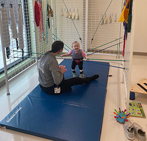 During physical therapy, Teddi is working on independent standing and walking. She loves to go on the swing and the slide and use the Spider Cage. The Spider Cage is designed to help kids safely participate in everyday functional activities. “If we could go five days a week, I’d be there every day. Teddi loves going there,” said Stacey.