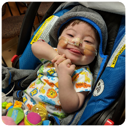Brighton turned 2 on October 1st and he is home now with his family. Brighton was using oxygen 24/7 up until early September to help his underdeveloped lungs but because he has gained so much physical strength his doctors have recently been able to take him off the oxygen, thanks in part to all the therapies he's received. He also requires a G-tube for feeding because of his low muscle tone, which caused aspiration during bottle feeds, and he's still learning to eat by mouth, as it takes a lot of coordination and strength. Brighton continues to go to Children’s in Warren for outpatient physical, occupational, and feeding therapies 3 days a week. The Mansours find their appointments at Children’s comforting and look forward to seeing Brighton’s therapists each week. They are working toward helping Brighton gain more independence, sitting up on his own and moving about with crawling.