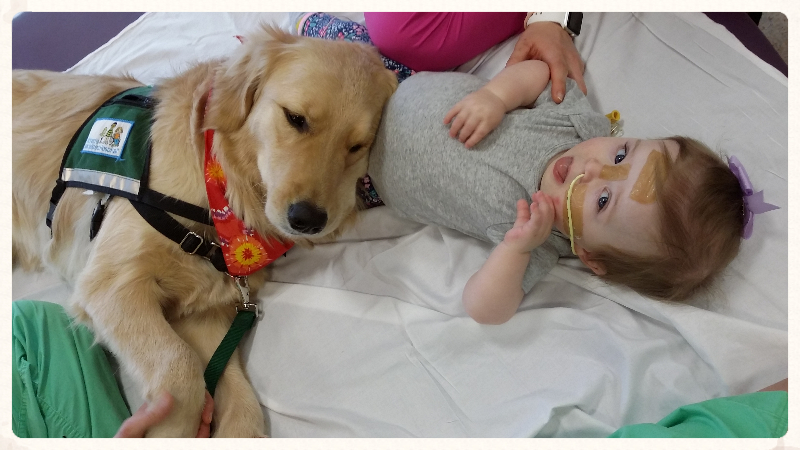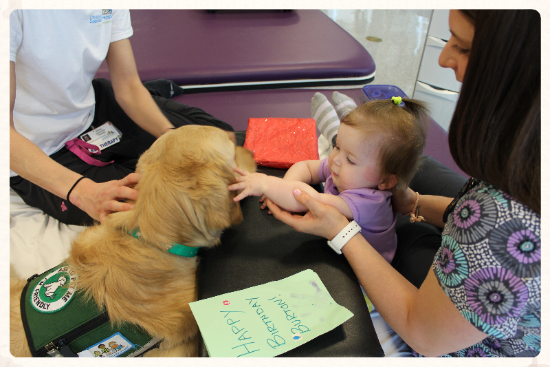 Besides the amazing therapists that have helped Ava reach new heights, one very special Children’s Specialized employee has had a profound impact on her experience at the inpatient hospital. Laura’s face lights up as she describes the joy and excitement that Burton, the two-year-old hospital therapy dog, brings into Ava’s therapy sessions. During therapy, Burton positions himself across from Ava so that she can work on stretching and moving her arms to reach him. He runs back and forth across the room so that she works on turning her head from side to side. She stays extremely focused on Burton throughout sessions which makes therapy all that more entertaining for her.